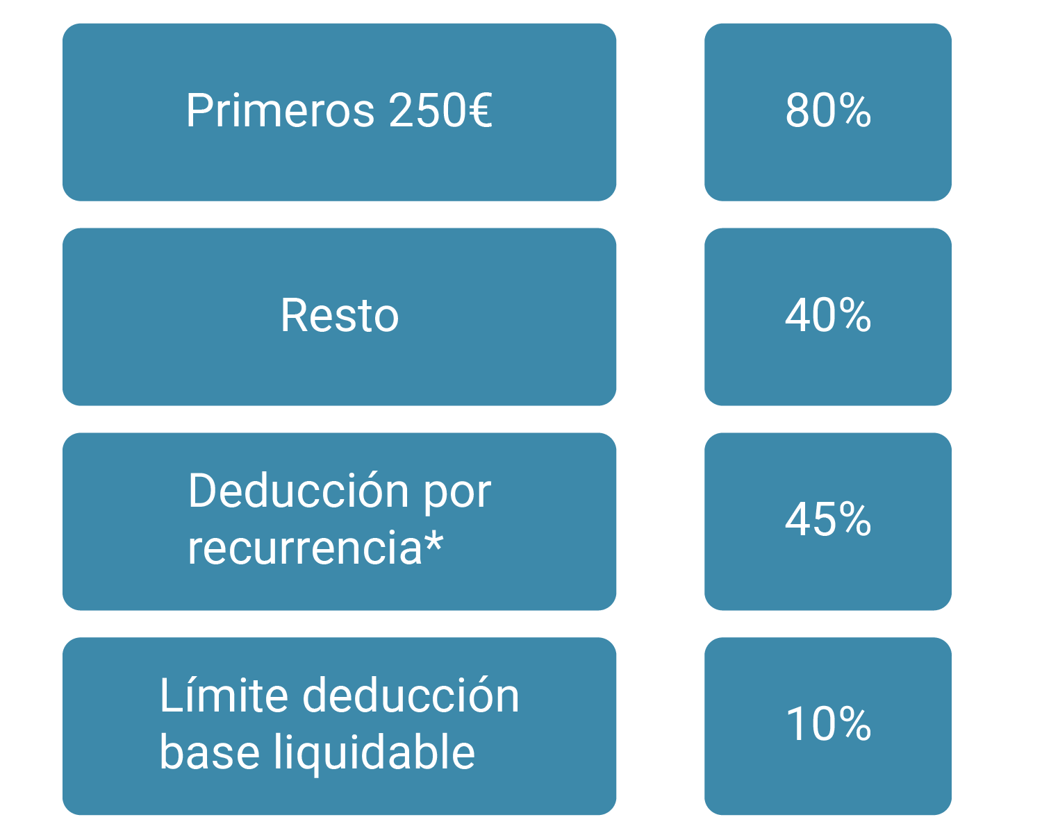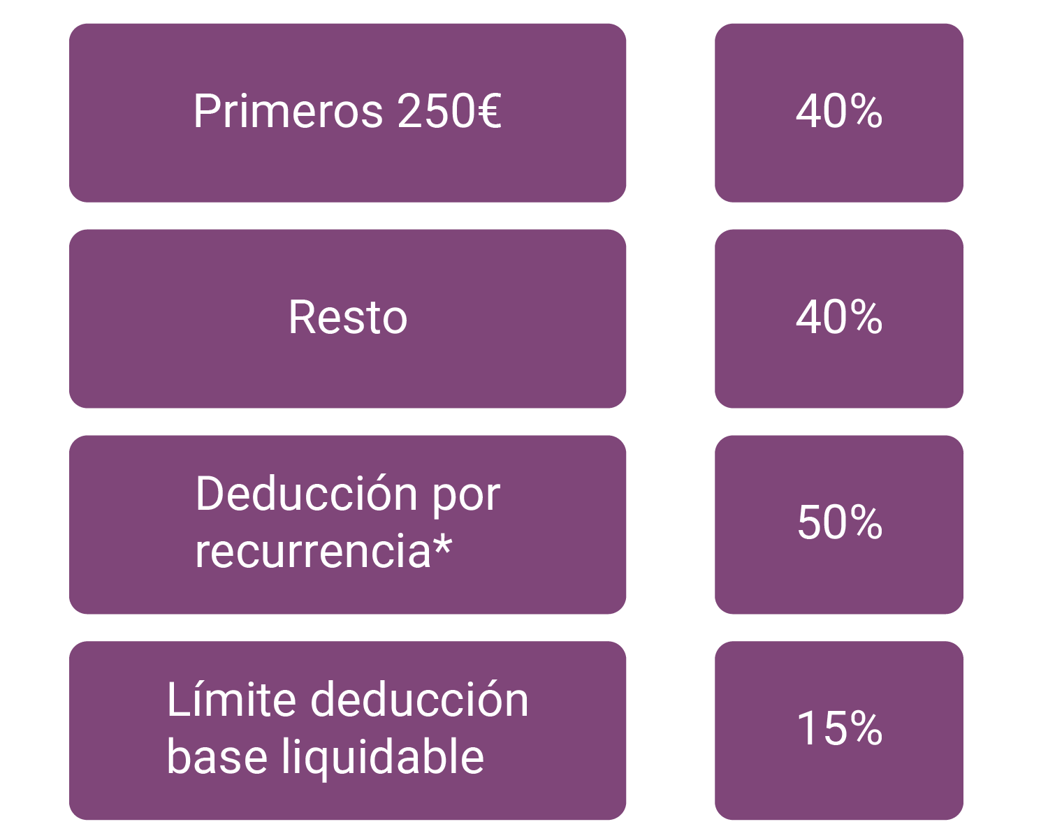 * La recurrencia se refiere a la realización de donativos, donaciones o aportaciones en los dos periodos impositivos inmediatos anteriores en favor de una misma entidad, siempre que el importe de lo donado en el propio ejercicio y en el anterior, sea igual o superior, en cada uno de ellos, al del ejercicio anterior. La donación que exceda de 250@ será del 45%.